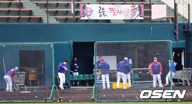 KIA 타자들이 타격훈련을 진행하는 가운데 '공을 찢자' 라는 현수막이 눈길을 끌고 있다.