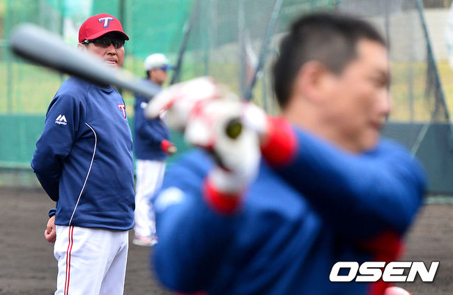 KIA 김기태 감독이 타격 훈련 중인 최희섭을 바라보고 있다.