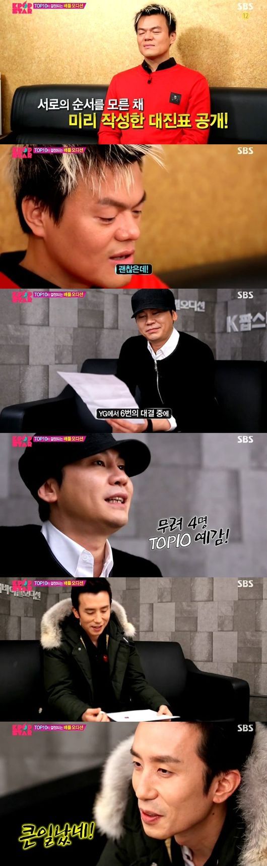 가장 먼저 대진표를 받아든 박진영은 조심스럽게 살펴보더니 이내 표정이 밝아지며 "괜찮은데? 운이 좋은 것 같다"고 솔직한 심경을 전했다. 이어 등장한 양현석 역시 환하게 웃는 얼굴로 "YG에서 4명이 TOP10에 올라갈 걸 예상한다"고 자신감을 내비쳤다.