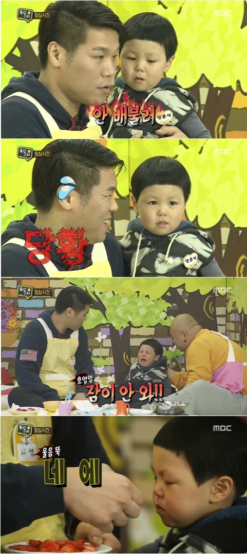 이내 서장훈은 낮잠을 유도했다. 윤석이는 "안 졸려"라고 말하면서도 시키는 대로 누웠지만, "잠이 안와"라고 곧 눈물을 터트렸다. 당황한 서장훈은 "딸기 주면 안 울거지"라고 말했고, 윤석이는 눈물을 그치고 "네"라고 답해 웃음을 자아냈다.