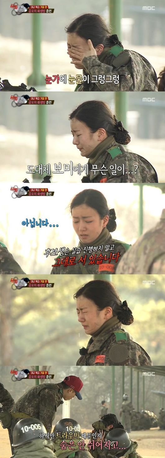 이날 윤보미는 방독면을 쓰는 실습 중 하염없이 눈물을 흘렸다. 그는 "어렸을 때 해병대 캠프에 갔었는데, 그 때 화생방 훈련 중 안좋았던 기억이 있다"고 밝혔다.