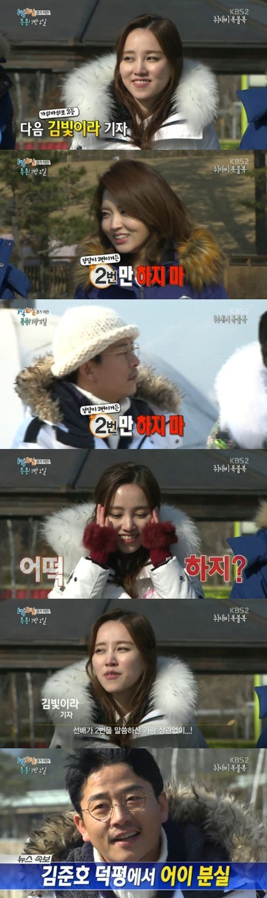 8일 방송된 KBS 2TV 예능프로그램 ‘해피선데이-1박2일’에서는 김나나 강민수 김도환 김빛이라 이재희 정새배 등이 출연한 기자 특집이 그려졌다.