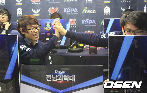 전남과학대학교 '드림'(이하 CTU)은 8일 오후 서울 강남구 역삼동 인벤 강남스튜디오에서 벌어진 '2015 리그오브레전드 대학생 배틀(이하 LCB)' 결승전에서 강원대학교 '강대는강대라강대해(이하 강원대)'를 2-1로 이겼다. 1세트를 내줬지만 뒷심을 발휘하면서 2, 3세트를 연달아 따내면서 우승컵을 차지했다. CTU가 우승의 기쁨을 하이파이브로 기뻐하고 있다. / scrapper@osen.co.kr