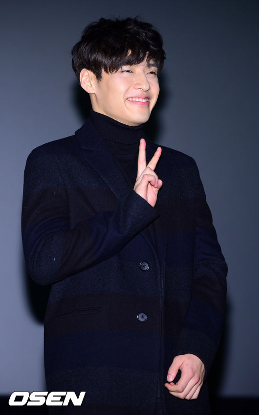 배우 강하늘이 무대 인사를 하며 브이 사인을 하고 있다.