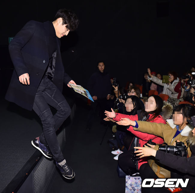 배우 강하늘이 팬들에게 선물을 주기 위해 관객석으로 뛰어 내리고 있다.