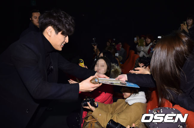배우 강하늘이 팬들에게 선물을 주고 있다.