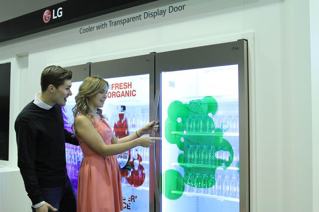 LG전자는 투명 디스플레이를 활용한 ‘LG 투명 쿨러 도어’도 선보인다. 매장에 있는 냉장고의 문을 ‘LG 투명 쿨러 도어’로 바꾸기만 하면 문을 열지 않고도 냉장고 안에 있는 상품들이 보이게 된다.