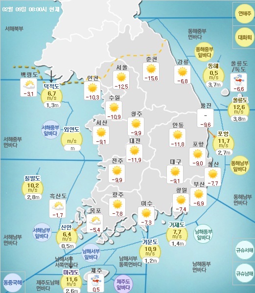 9일 기상청에 따르면 서울을 포함한 전국 대부분 지역의 아침 최저기온이 올 들어 가장 낮은 분포를 보이고 있다. 특히, 일부 지역에서는 올 겨울 들어 가장 낮은 기온 분포를 보이고 있다.