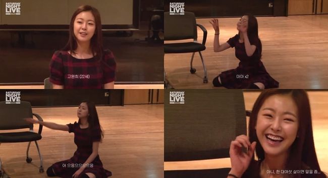 앞서 고원희는 방송인 신동엽이 직접 참여했던 'SNL코리아' 오디션 현장에서 '유치원생 연기를 해 볼 수 있겠느냐?'는 면접관의 질문에 바닥에 앉아 기면서 "마마, 마마! 어 으응으으으응"이라는 영·유아 메소드 연기로 현장의 큰 웃음을 자아냈다.