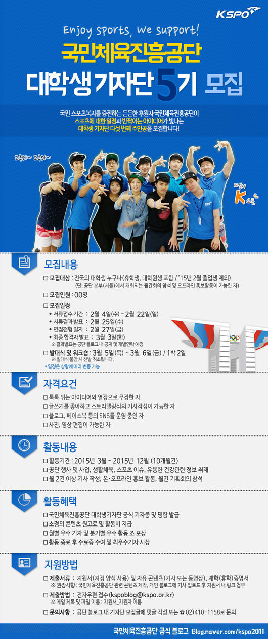 지원방법은 국민체육진흥공단 공식 블로그(http://blog.naver.com/kspo2011) 모집 페이지에 있는 지원서 및 콘텐츠를 작성해 이메일(kspoblog@kspo.or.kr)로 제출하면 된다.