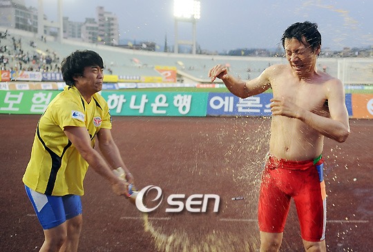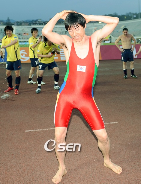 양복안에 빨간색 레슬링복을 입고 맥콜을 뿌리는 이벤트를 진행한 것. 이날 경기장을 찾은 관중들은 "신태용"을 외치면서 기쁨을 함께 했다.