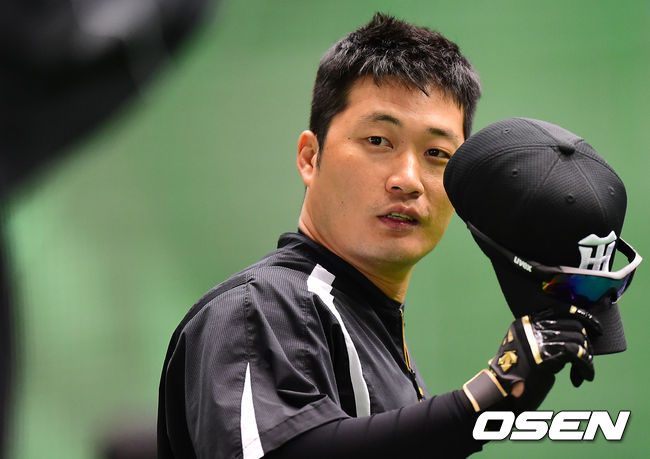 오승환이 실내 워밍업 훈련 중 코치진에게 인사하고 있다.