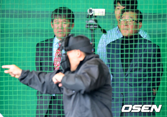 한신 스프링캠프를 방문한 KIA 김기태 감독과 조계현 수석코치가 선수들의 한신 투수들의 불펜 투구를 바라보고 있다.