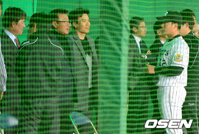 오승환이 불펜 피칭을 마치고 한신 스프링캠프를 방문한 KIA 김기태 감독, 조계현 수석코치, 이대진 투수코치 등과 인사를 나누고 있다.