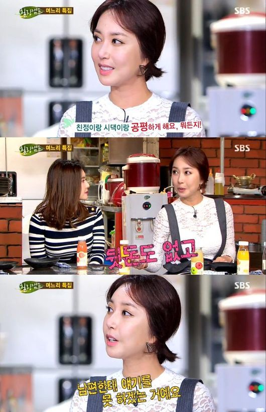 그는 "시댁과 친정이 평등하고 뒷 돈도 없다"면서 "몰래 챙겨주고 그런 것이 없다"고 덧붙였다. 그러면서 "친정 어머니 피부 리프팅을 해드렸는데, 남편이 알게 돼 시어머니도 해드렸다"고 말해 웃음을 자아냈다.