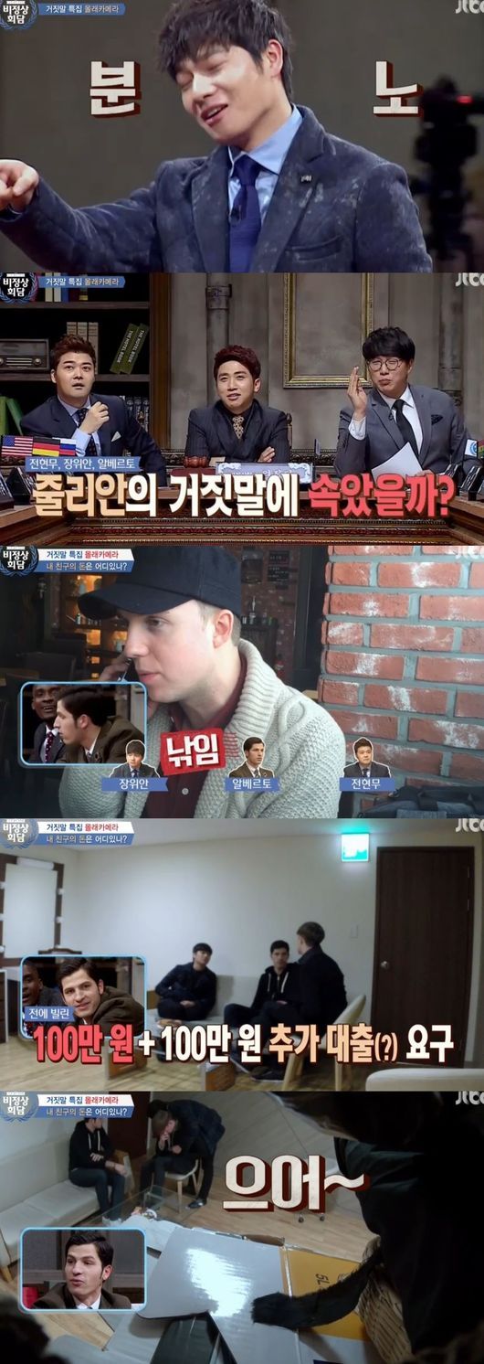 9일 방송된 JTBC '비정상회담'에서는 거짓말을 주제로 이야기를 나눴다. 이날 줄리안은 전현무, 장위안, 알베르토를 솔이고 돈을 꾸는 내용이 전파를 탔다.