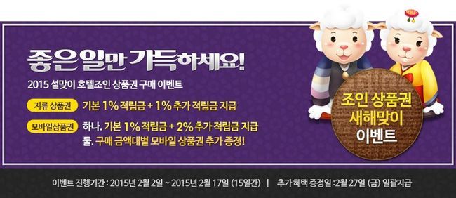 국내·해외 호텔&리조트 할인예약 전문 호텔조인(www.hoteljoin.com)에서 2015 설맞이 상품권 구매 이벤트를 진행 중에 있다.