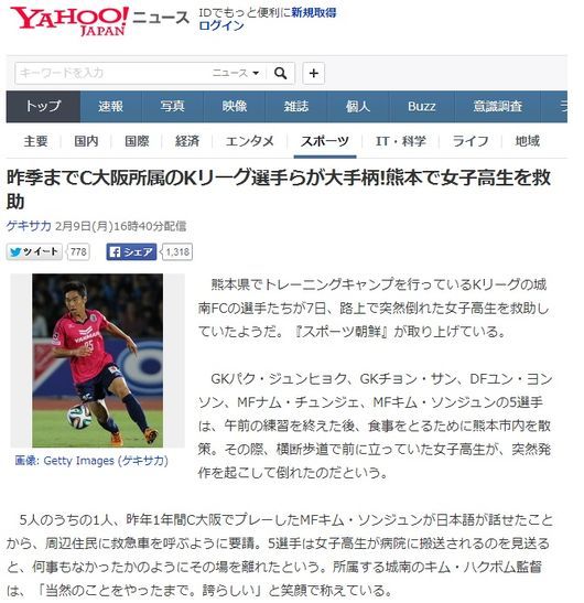 외출을 나온 구마모토 현지 길거리에서 쓰러진 일본인 여고생을 구해 화제를 모았던 성남FC의 골기퍼 박준혁, 정산, 수비수 윤영선, 미드필더 남준재, 김성준의 선행이 일본에서 최고의 이용자를 자랑하는 온라인 매체 야후 재팬을 통해 소개돼 잔잔한 감동을 울리고 있다.