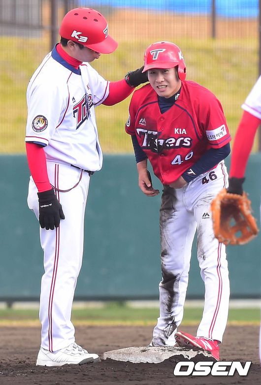 오후에 열린 팀 자체 홍백전, KIA 김종국 코치가 투수의 폭투를 틈타 3루 도루에 성공한 주자 박찬호와 대화를 나누고 있다.