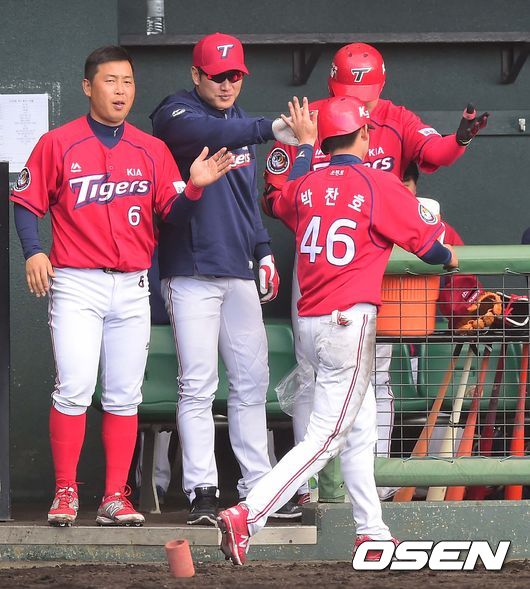 오후에 열린 팀 자체 홍백전, 3루 주자 박찬호가 희생플라이로 홈에 세이드 된 뒤 김주찬을 비롯한 동료들과 인사를 나누고 있다.