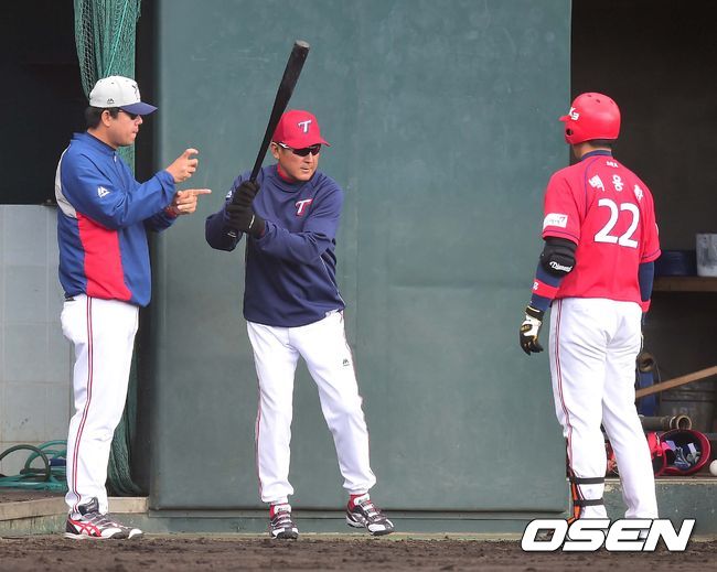 오후에 열린 팀 자체 홍백전, 김기태 감독과 홍세완 코치가 타격을 마치고 들어온 백용환과 대화를 나누고 있다.