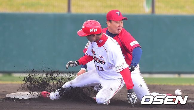 오후에 열린 팀 자체 홍백전, 주자 강한울이 3루에 세이프 되고 있다. 3루수는 이범호.