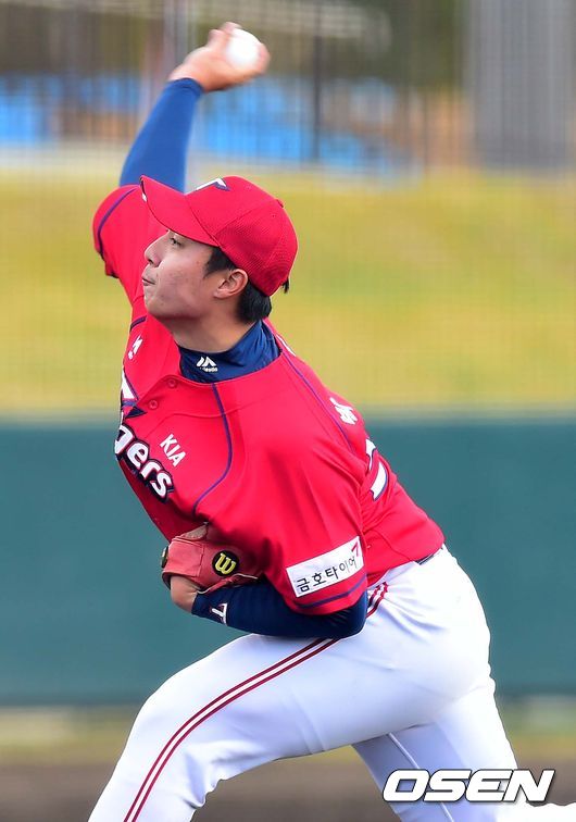 오후에 열린 팀 자체 홍백전, 투수 박상옥이 힘차게 공을 뿌리고 있다.