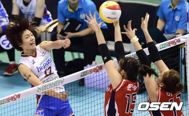 1세트 도로공사 문정원이 인삼공사 문명화, 이연주의 수비를 피해 공격시도하고 있다.