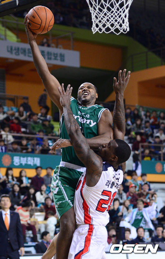 10일 오후 강원도 원주 종합체육관에서 열린 '2014-2015 KCC 프로농구' 원주 동부와 울산 모비스의 경기 3쿼터 사이먼이 라틀리프를 앞에두고 슛을 시도하고 있다.