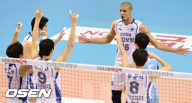 2세트 삼성화재 레오가 득점에 성공하고 기쁨을 나누고 있다.
