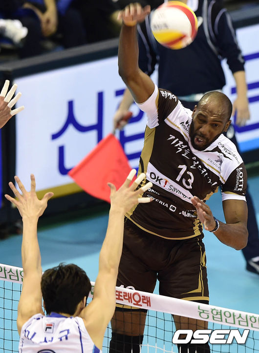 1세트 OK저축은행 시몬이 삼성화재 이민규의 수비를 피해 공격시도하고 있다.