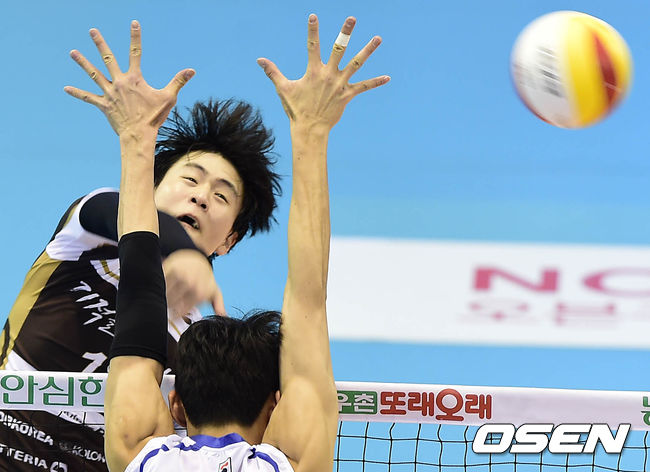 1세트 OK저축은행 송희채가 수비를 피해 공격시도하고 있다.