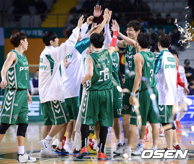 10일 오후 강원도 원주 종합체육관에서 열린 '2014-2015 KCC 프로농구' 원주 동부와 울산 모비스의 경기 종료 후 동부 선수들이 하이파이브를 하고 있다.