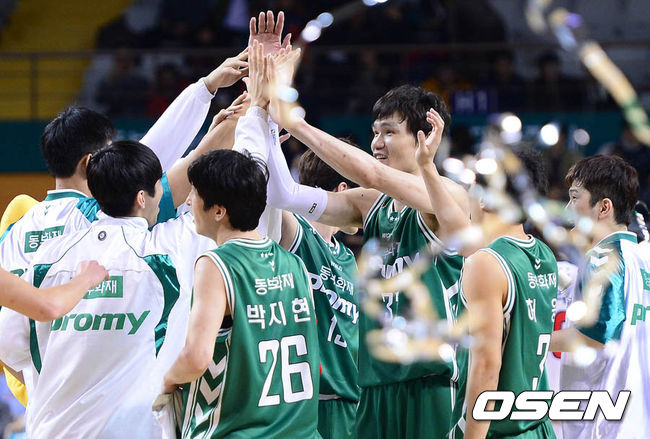 10일 오후 강원도 원주 종합체육관에서 열린 '2014-2015 KCC 프로농구' 원주 동부와 울산 모비스의 경기 종료 후 동부 선수들이 하이파이브를 하고 있다.