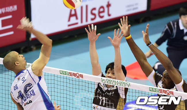 2세트 OK저축은행 박원빈과 시몬이 레오의 공격을 수비하고 있다../greenfield@osen.co.kr