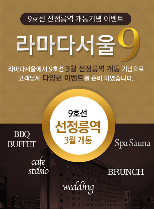 라마다서울호텔의 사우나에서는 9호선이 개통하는 3월 한달 동안 주간(6:00~22:00)에 사우나를 이용하는 이에게 입장료를 9999원(세금, 봉사료 미포함)에 판매하는 이벤트를 진행한다.