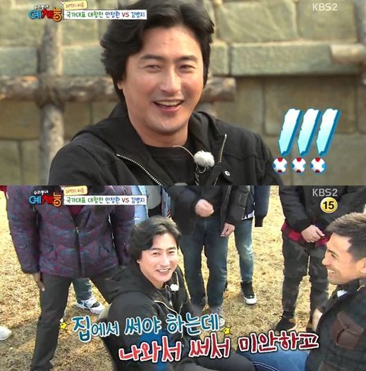 이날 방송에서 안정환은 김병지와 허벅지 씨름을 했다. 이에 앞서 아내에게 한 마디 해달라는 MC의 부탁에 그는 “집에서 써야 하는데 밖에서 써서, 여보 미안해”라고 밝혀 현장을 웃음바다로 만들었다.