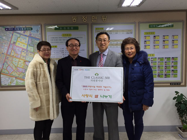 이번 불우이웃 돕기 행사는 더 클래식 500 자원봉사단 박동현 단장과 이선엽 지원팀장, 입주민으로 구성된 봉사단 회원들이 자양 3동 주민센터에 10kg 쌀 100포를 전달하는 것으로 진행됐다.