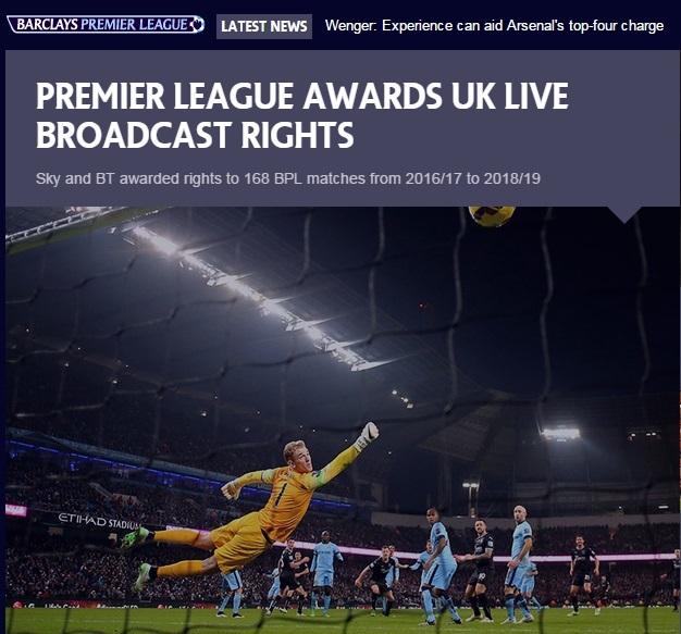 영국 공영방송 BBC는 11일(이하 한국시간) 속보를 통해 2016년부터 2019년까지 세 시즌 동안 EPL 504경기(시즌 당 168경기)를 생중계하는 영국내 중계권료가 51억 3600만 파운드로 결정됐다고 보도했다.