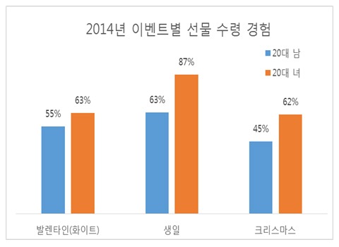 한달 간격인 발렌타인데이와 화이트데이에 남녀가 서로 선물을 주고받게 되는데도 불구하고 약 8%의 차이로 남성이 여성보다 선물을 받지 못하는 것으로 조사됐다. 화이트데이에 여성에게 선물을 하는 남성의 약 13%는 발렌타인데이에 선물을 받지 못한 것이다. 아울러 여성들은 대다수가 생일 및 크리스마스 선물을 받는데 비해, 남성들은 절반 정도만이 받는 것으로 나타나 선물에 대한 경험도 남녀차가 큰 것으로 나타났다.