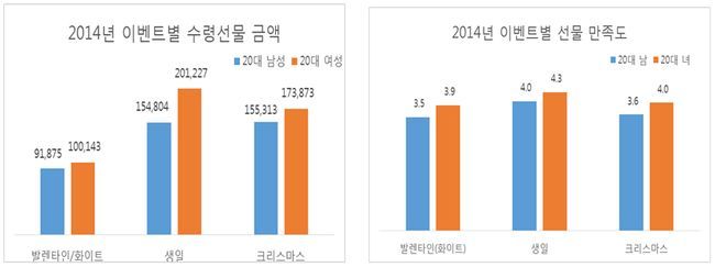 더불어 생일과 크리스마스에 평균적으로 17만 원을 소비하는 반면, 발렌타인/화이트데이는 40% 이상 저렴한 10만원을 소비함에도 상대적으로 높은 만족도를 나타냈다.