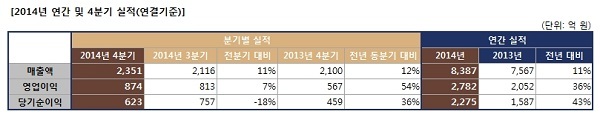 4분기에는 매출 2,351억 원, 영업이익 874억 원, 당기순이익 623억원을 달성하며, 전년동기 대비 매출 12%, 영업이익 54%, 당기순이익 36%의 상승세를 기록했다.