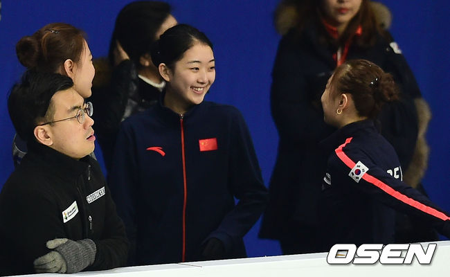 11일 오전 서울 목동아이스링크에서 진행된 '2015 사대륙 피겨선수권 대회' 여자 피겨 싱글 연습세션에 앞서 리지준과 박소연, 김해진이 이야기를 나누고 있다