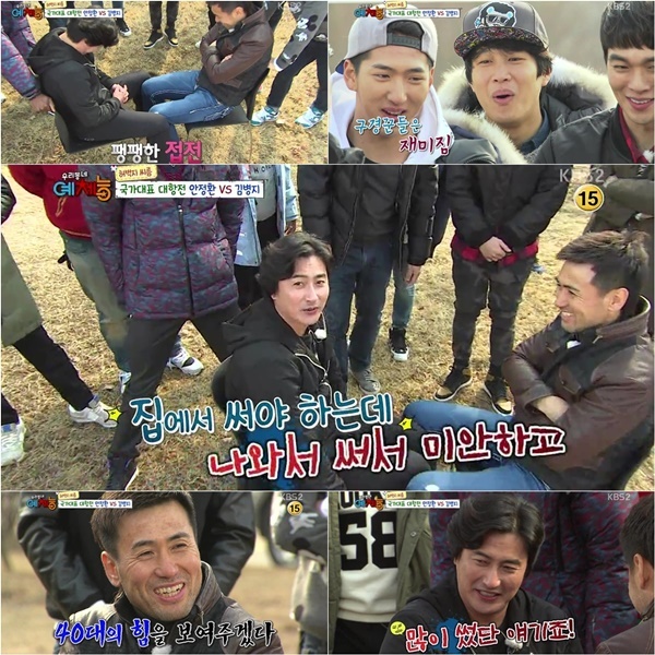 지난 10일 방송된 KBS 2TV 예능프로그램 '우리동네 예체능'(이하 '예체능') 92회에서는 안정환과 김병지가 서로 칭찬하면서도 은근한 경쟁심까지 보여 눈길을 끌었다. 안정환은 강호동이 김병지가 어떤 사람인지 묻자 "몸 관리의 표본"이라고 추켜세웠고, 김병지는 안정환에 대해 "한국 축구의 역사를 바꾼 헤딩골"이라며 2002년 이탈리아 전을 회상했다.