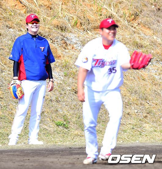 KIA 양현종이 팀 동료 임준혁의 수비 훈련을 지켜보며 미소짓고 있다.