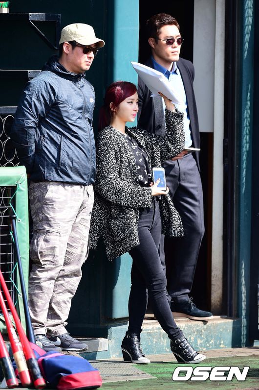 KIA 스프링캠프를 찾은 안치용 해설위원, 윤태진 아나운서, 조성환 해설위원이 KIA 선수들의 훈련을 바라보고 있다.