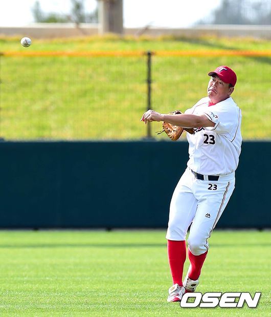 포지션을 바꿔 진행된 수비훈련에서 최희섭이 외야에서 송구를 하고 있다.