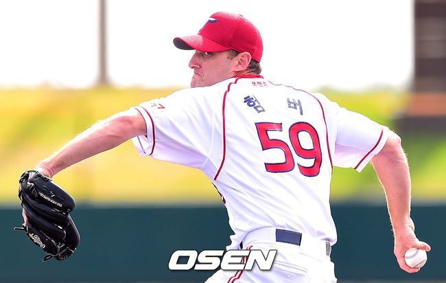 KIA 새 외국인투수 필립 험버가 KIA 타자들을 상대로 첫 라이브피칭을 하고 있다.