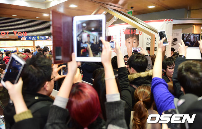 팬들이 사인회장을 가득 메워 박지성의 모습을 카메라로 담고 있다.
