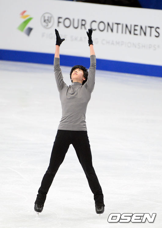 11일 오후 서울 목동아이스링크에서 진행된 '2015 사대륙 피겨선수권 대회' 남자 피겨 싱글 연습세션에서 변세종이 연기를 펼치고 있다.